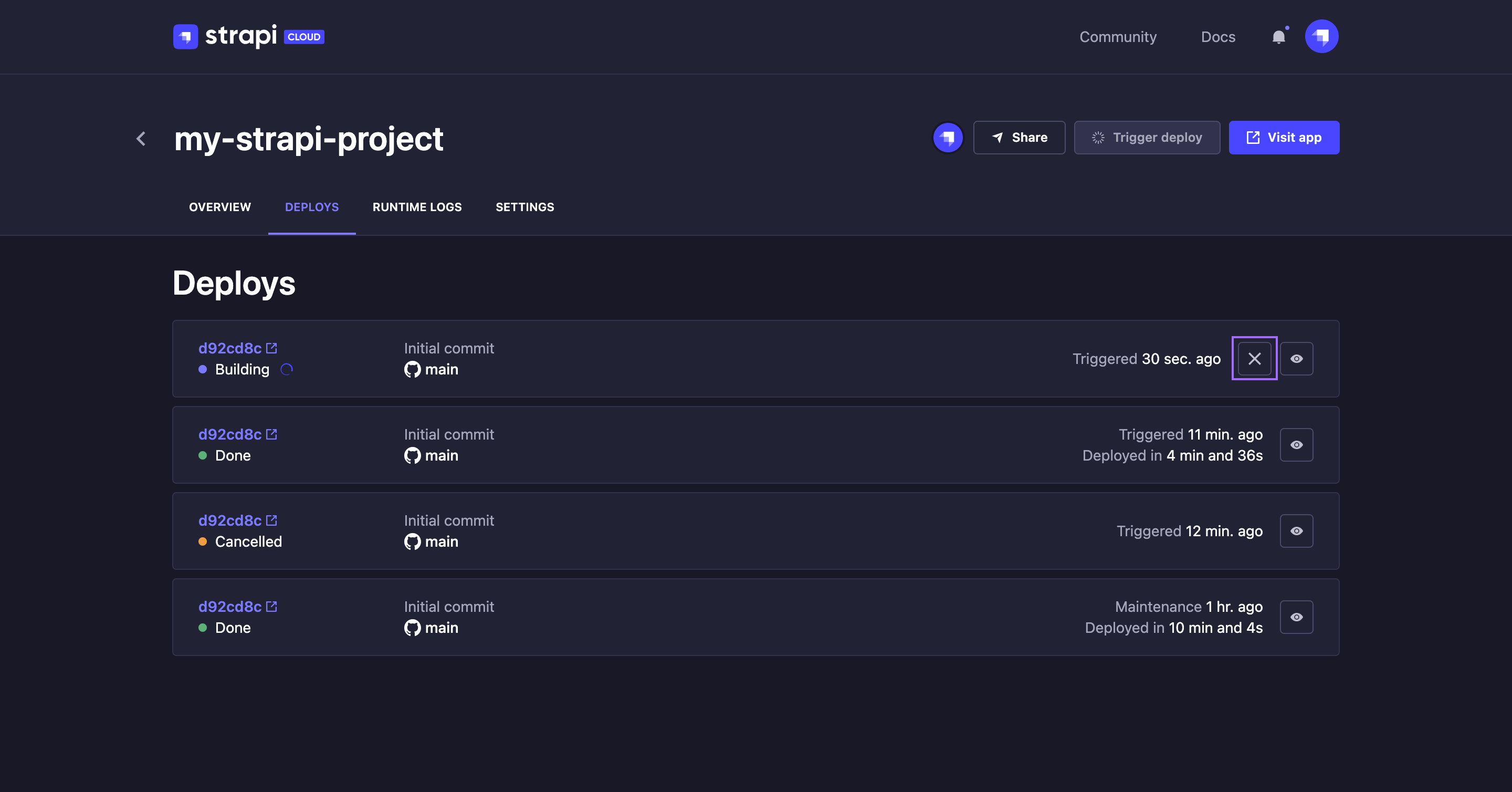 - or automatically triggered everytime a new commit is pushed to the branch, if the Strapi Cloud project is connected to a git repository and the "deploy on push" option is enabled (see Project settings).